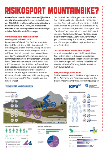 Passend zum Start der Bike-Saison veröffentlichte das KFV (Kuratorium für Verkehrssicherheit) und das ÖKAS (Österreichisches Kuratorium für Alpine Sicherheit) eine neue Studie, die interessante Einblicke in das Nutzungsverhalten und Unfallge- schehen beim Mountainbiken zeigen.
