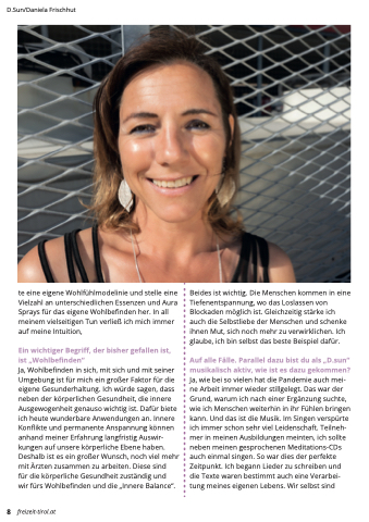 Auf alle Fälle. Parallel dazu bist du als „D.sun“ musikalisch aktiv, wie ist es dazu gekommen? Ja, wie bei so vielen hat die Pandemie auch mei- ne Arbeit immer wieder stillgelegt. Das war der Grund, warum ich nach einer Ergänzung suchte, wie ich Menschen weiterhin in ihr Fühlen bringen kann. Und das ist die Musik. Im Singen verspürte ich immer schon sehr viel Leidenschaft. Teilneh- mer in meinen Ausbildungen meinten, ich sollte neben meinen gesprochenen Meditations-CDs auch einmal singen. So war dies der perfekte Zeitpunkt. Ich begann Lieder zu schreiben und die Texte waren bestimmt auch eine Verarbei- tung meines eigenen Lebens. Wir selbst sind