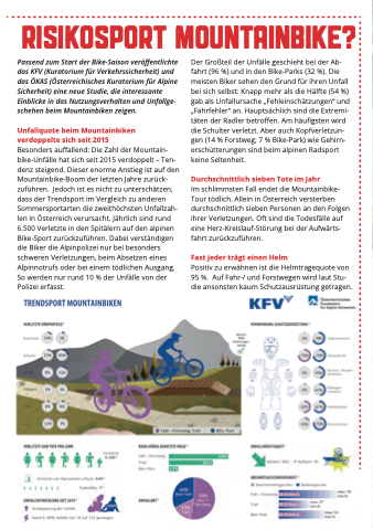 Passend zum Start der Bike-Saison veröffentlichte das KFV (Kuratorium für Verkehrssicherheit) und das ÖKAS (Österreichisches Kuratorium für Alpine Sicherheit) eine neue Studie, die interessante Einblicke in das Nutzungsverhalten und Unfallge- schehen beim Mountainbiken zeigen.