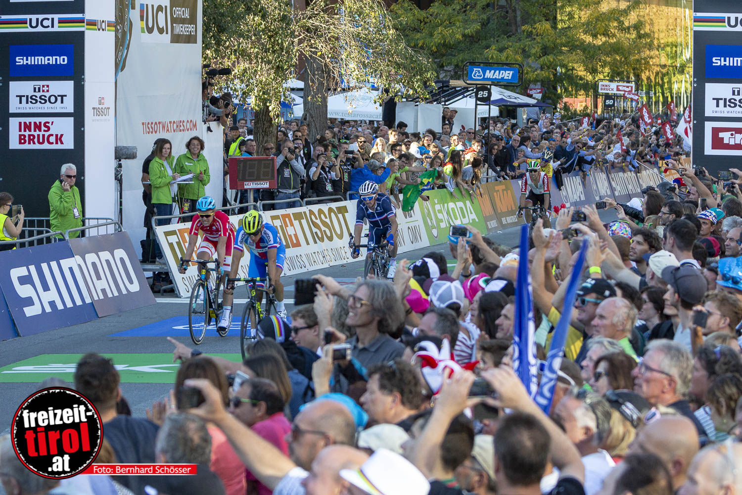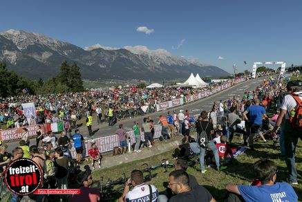 Die Rad-WM in Innsbruck - Tirol! Eine im Vorgeld sehr kontrovers diskutierte Veranstaltung ging mit dem Höhepunkt, dem Rennen der weltbesten Straßenprofis, zu Ende. Kein Rennen für Weicheier, warteten doch 258,5 Kilometer mit 4.670 Höhenmetern inklusive 28 Prozent steilem Schlussanstieg auf die Höttinger Höll auf die Starter. Der Routinier Alejandro Valverde, im Vorfeld einer der meistgenannten Favoriten für den WM-Titel, setzte bei der Straßenrad WM seiner beeindruckenden Karriere die Goldmedaille auf. Vor einer gewaltigen Zuschauermenge mit insgesamt 270.000 Besuchern verwies er den Franzosen Romain Bardet und den Kanadier Michael Woods im Sprint eines Quartetts auf die Plätze. Hier die Bilder vom Olympia-Rundkurs und aus dem Zielgelände am Rennweg in Innsbruck!