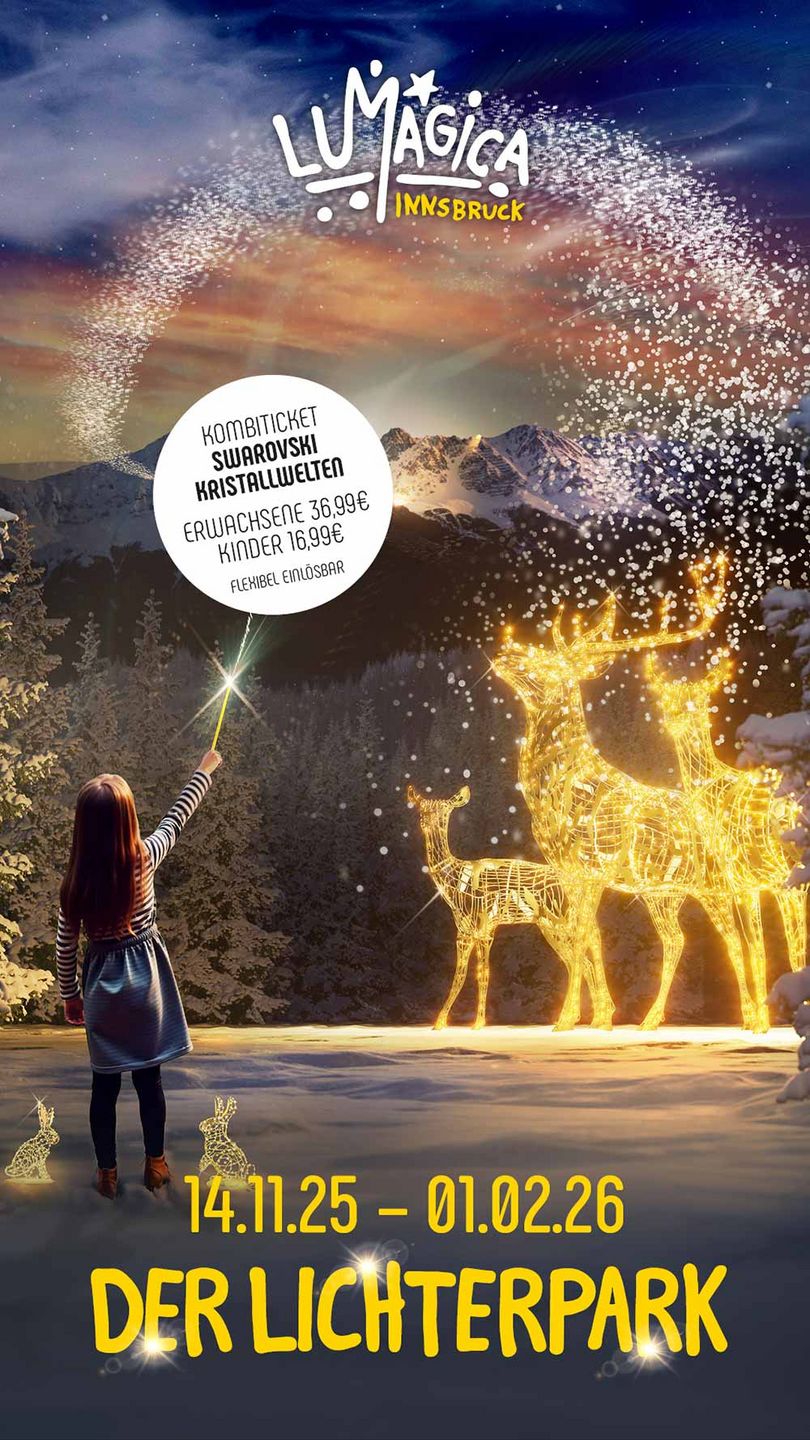 Bereits zum sechsten Mal kehrt LUMAGICA nach Innsbruck zurück und verwandelt den historischen Hofgarten in eine leuchtende Erlebniswelt. Unter dem Motto „Innsbrucker Winterzauber“ erwarten die Besucherinnen und Besucher kunstvolle Lichtinstallationen, interaktive Elemente und stimmungsvolle Szenen, die zum Staunen, Mitmachen und Verweilen einladen.