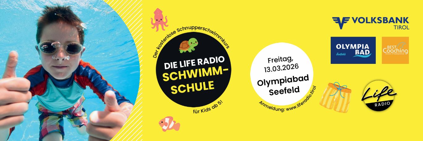Gemeinsam mit Life Radio Tirol lädt das Olympiabad Seefeld Kinder zu einer besonderen Schwimmstunde ein. Bei der Life Radio Schwimmschule lernen Kinder spielerisch die Grundlagen des Schwimmens und den sicheren Umgang mit dem Wasser.