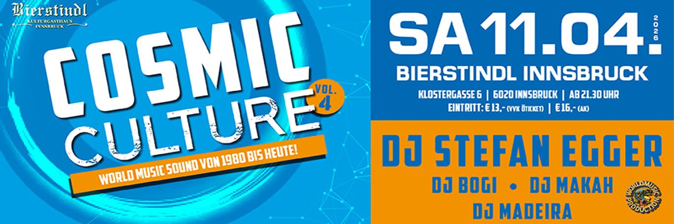 Am Samstag, den 11. April 2026, verwandelt sich das Kulturgasthaus Bierstindl wieder in den Tempel des Afro-Cosmic-Sounds! Erlebe eine hypnotische Nacht voller treibender Rhythmen, Ethno-Beats und dem unverkennbaren Sound, der Generationen verbindet. Wir bringen die „Kult-Vibes“ zurück auf den Dancefloor – von World Music über Tribal bis hin zu modernen Cosmic-Grooves. Tauch ein in die Cosmic Culture – wir sehen uns am Dancefloor!
