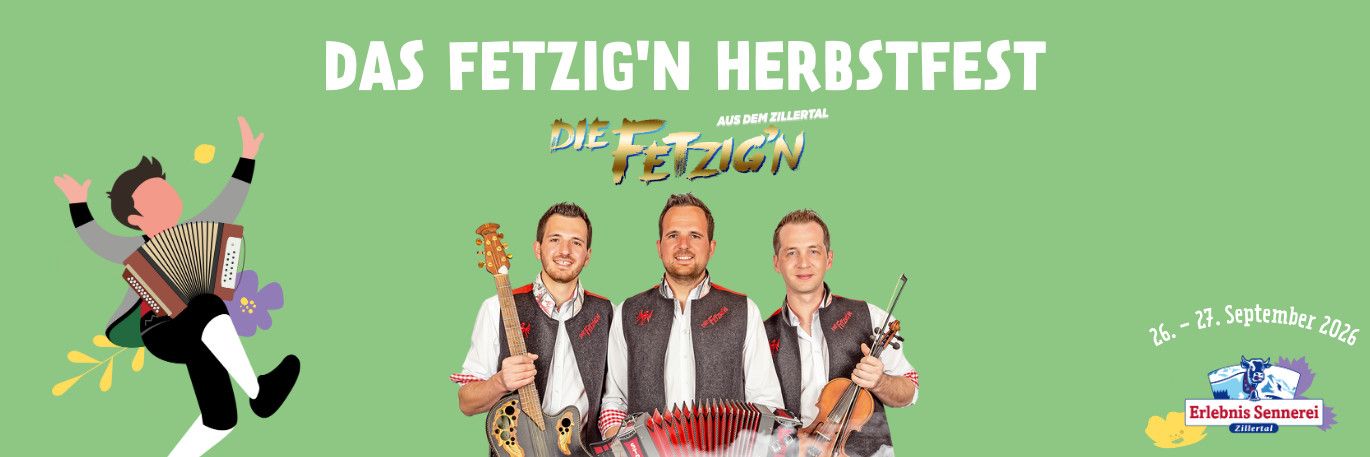 Am 26. September 2026 lädt die Erlebnissennerei Zillertal zum Fetzig'n Herbstfest ein. Beste Stimmung und Musik mit Die Fetzig'n aus dem Zillertal an zwei Tagen in der Erlebnissennerei Zillertal in Mayrhofen!