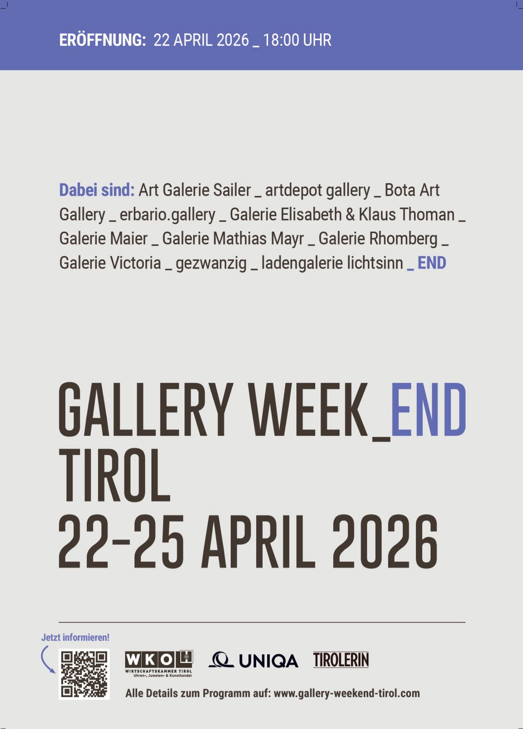 An 12 Standorten öffnen Tiroler Galerien ihre Türen und präsentieren ein vielfältiges Programm aus Ausstellungen, Führungen, Gesprächen und Veranstaltungen. Kunstinteressierte in Innsbruck können sich zudem auf geführte ART_WALKS freuen. Die Spaziergänge durch die Galerien der Landeshauptstadt bieten spannende Einblicke in die vielfältige Kunst- und Kulturszene. Zudem werden im Rahmen eines ART_WALKS ausgewählte Werke der Wirtschaftskammer präsentiert und das historische Egger-Lienz-Zimmer zugänglich gemacht.
